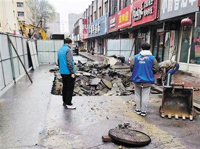 社区工作人员查看塌陷情况后,确认塌陷处位于安宁路东侧商铺门前道路。为避免发生意外,社区工作人员临时用周围物品围挡住塌陷口并放置警示标志。随后,社区立即联系市政部门,告知其详细情况及安全隐患问题。之后,市政维修工作人员火速赶到现场查找塌陷原因,并对破损路面展开修整,经查得知,由于污水主管道年久失修,污水外溢冲刷导致泥土流失,因而造成路面塌陷。经过抢修,路面已恢复平整,可以正常通行,围观居民纷纷竖起大拇指。