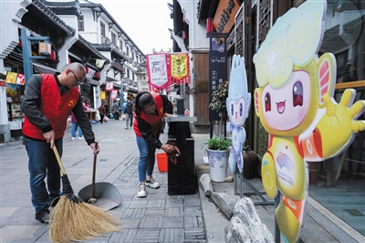4月24日,在建德市梅城镇古街,社区党员干部、志愿者在打扫古镇卫生。