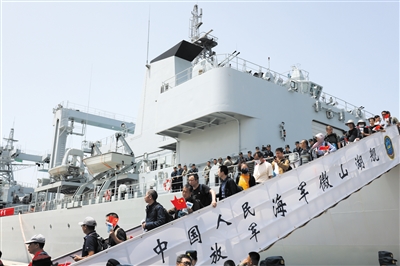 中国海军导弹驱逐舰南宁舰和综合补给舰微山湖舰缓缓停靠入泊位,两舰庞大舰体填满码头三分之二的泊位。舰上人员还没下舰,就和岸上人群热烈互动,大家用力挥舞手中的国旗,相互致意。