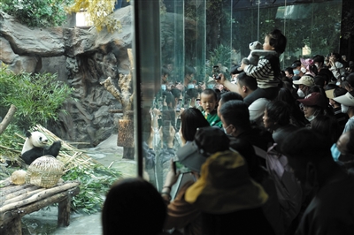 4月30日,游客在北京动物园大熊猫馆观赏大熊猫。