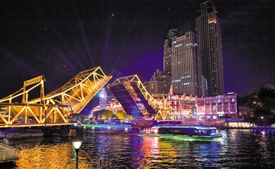 5月1日晚,位于天津海河上的标志性建筑物解放桥桥梁开启,桥梁开启角度达到最大角度60度。