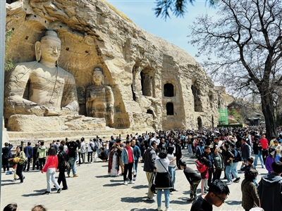 “五一”假期,我市丰富独特的旅游资源吸引八方游客纷至沓来,感受古都魅力。图为游客在云冈石窟景区参观。 本报记者 于宏 摄