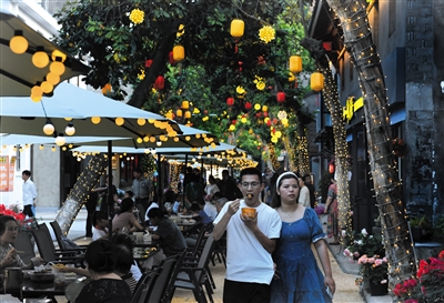 5月4日,食客行走在新昌县小吃集聚区南街“碳水王国”。