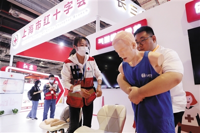 5月8日,一位参观者在工作人员指导下体验气道梗阻应急救援操作。