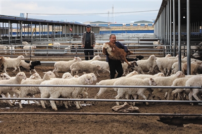 5月7日,在位于古浪县大靖镇现代养殖产业园的春旭农牧专业合作社,养殖人员捉羊去剪羊毛。