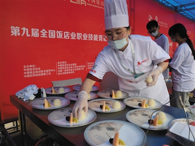 ◀5月10日,参赛选手在比赛现场对菜肴进行摆盘。