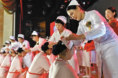 5月10日,山东省烟台护士学校举行护士节授帽仪式,护理前辈为即将踏入实习岗位的学生授帽。