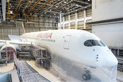 这是5月11日在海南自贸港一站式飞机维修产业基地内拍摄的空客A350-900宽体客机。