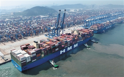 ▲运载量达2.4万TEU的“现代都柏林”轮(前)靠泊山东港口青岛港全自动化码头(5月14日摄,无人机照片)。
