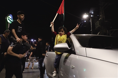 5月13日,巴勒斯坦人在加沙城街头庆祝停火协议达成。