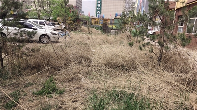 这处三角形状的绿化带位于南平街北侧,与中央美域小区衔接处。绿化带内除了几棵松树存活外,草坪荒废了无生机,有的地面黄土裸露,有的地面荒草丛生,还有很多1米多高的枯枝败叶,整个绿化带杂乱不堪。