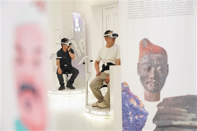 观众在位于北京的RE睿·国际创忆馆体验展示兵马俑影像信息的VR设备(5月14日摄)。
