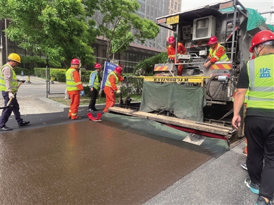 19日下午,记者在迎宾街御河西路至永泰南路段北半幅道路施工现场看到,一台摊铺机缓慢向前推进,“褐色”的路面在工人身后延伸,不一会儿后,路面又变成了黑色,压路机开始来回碾压,路面变得平坦顺畅。