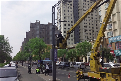 图为施工人员在滨河路安装智能监控设备。 本报记者 戎禹仁 摄