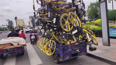 是日11时许,记者途经北都街发现,在北侧非机动车道上,一辆满载共享单车的三轮车正由东向西行驶。车上拉了几十辆共享单车,一层一层摞上去,大约有3米高。上方的共享车辆不停摇晃,经过的骑车市民远远躲开。