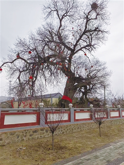 从仿古街折返出来,其东侧盖有游客活动中心和仿古的游廊,南侧不远处有一个小院里圈着一棵树,看这个阵势,就觉得这棵树应该不同寻常。右侧有一个牌子,上书“千年古榆树”,并配有说明,大体意思是:古榆树已有上千年历史,其来历有3种说法,一是古榆树是当时守堡的一位将军的化身,将军一生征战,生死都要守护百姓平安、守卫边城安危,所以化身为古树,永远扎根于此;二是古榆树上有宝物“逼水珠”。镇边堡建于沟谷处,地理位置特殊,极易受洪水冲淹,由于有宝物“逼水珠”的保护,建堡至今,从未发生洪涝灾害;其三,某时有一个盗宝人偷走“逼水珠”,一路往大同方向走去,由于事出意外,“逼水珠”沿途洒落,便形成一孔孔泉眼,“万泉河”就是这样诞生的。进到门洞,古树前立有一块石碑,上书“龙族之位”,这棵树也太古老了,树的底部已成空洞,满身的伤痕,树北面摆着一张贡桌。算来古树大约诞生于宋朝,是镇边堡悠久历史的见证者。由古树可以似乎读出城堡的千古沧桑。