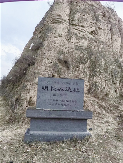 镇边堡的北侧是大同市旅游一号线,由旅游线向北抬眼望去墩台密布,像秋日田野上一垛垛麦垛似的,这么密集的烽台,在国内还是罕见的。我走到一座烽火台下,仔细端详,那烽火台像一位布满皱纹的老者,满是苍桑,西面立着一块石碑,上书“明长城遗址-镇边堡段”。之所以有如此密集的墩台,是因为这一带地势平坦,外长城对于蒙古大军无险可守,明军在长城两侧修建了高大密集的墩台,与边墙互为犄角交叉防御,形成墩台交错林立之势。墩台密集给人一种烽燧连天的感觉,视觉上非常壮观,虽残破,仍不失先时高大雄壮之气势。