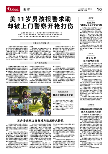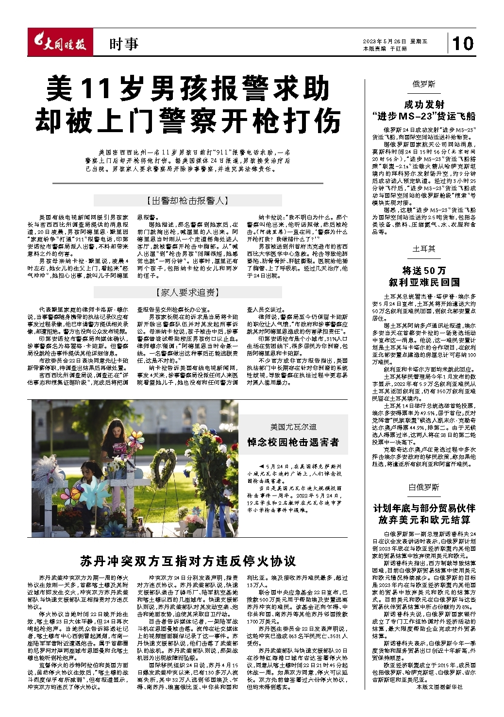 ~~~美国密西西比州一名11岁男孩日前打“911”报警电话求助,一名警察上门后却开枪将他打伤。据美国媒体24日报道,男孩接受治疗后已出院。男孩家人要求警察局开除涉事警察,并追究其法律责任。
