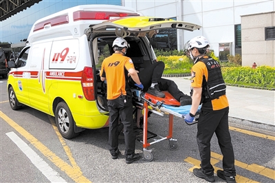 ◀ 5月26日,在韩国大邱机场,救援人员用担架将出现呼吸困难的乘客转移到救护车上。