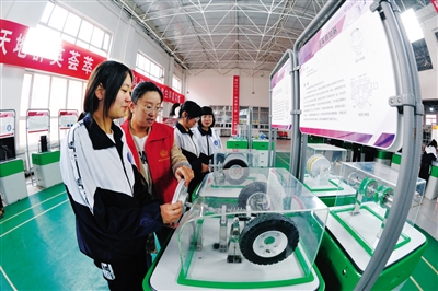 5月30日上午,中国流动科技馆巡展走进新荣区,为期2个月的科技展在新荣区职业技术学校拉开帷幕。 图为新荣区职业技术学校的学生们在汽车生活展区参观、体验。 本报记者 于宏 摄