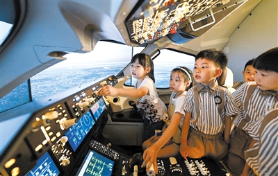 6月1日,在天津华夏未来儿童科技馆,孩子们在C919科普模拟机内体验模拟飞行。