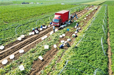6月1日,农民在河北省玉田县玉田镇一处供京蔬菜基地内收获马铃薯(无人机照片)。