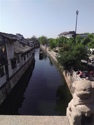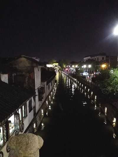 人从桥上过,船从桥下走,桥是水乡的情愫。行走在桥上,桥的两端不时有游客坐在船上,有的在闲聊,更有年轻女子穿着汉服举着一把五颜六色的小伞举在头上,在音乐的陪伴下,让人又穿越了数百年前的烟雨江南。夜幕降临之后,古镇没有了白天的喧哗,伴随着万家灯火亮起,夜色下的古镇那深厚的底蕴随之流露出来,站在岸边或桥上,随手一拍,水面倒映着灯火、民居、行人、宛如一幅浓墨重彩的水墨画。