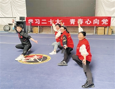 活动现场,社区工作人员对党的二十大精神进行宣传,让学生们了解中国共产党百年光辉奋斗历程。随后,在气膜训练馆,社区工作人员与学生一起学习武术,并观看了精彩的武术表演,只见学生们动作整齐标准,出拳刚劲有力,一招一式彰显出青年学生的精神面貌,大家不仅锻炼了身体,而且在体验中感受到了武术文化的魅力。