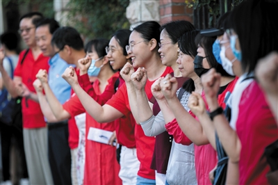 6月7日,北京市门头沟区大峪中学考点外,教师为考生加油。