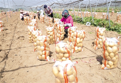 6月8日,昌黎县新集镇西新庄村农民在田间将收获的马铃薯打包。