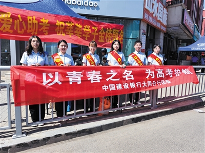 本报讯 今年高考期间,建行大同分行积极履行社会责任,在考点周边设立服务站,为考生及家长提供便利,为考务工作者送去清凉。