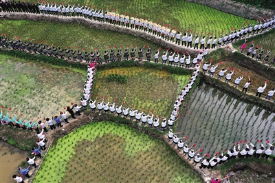 6月10日,人们在黎平县肇兴侗寨的田园中演唱侗族大歌(无人机照片)。