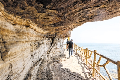 位于渤海湾山东长岛海洋生态文明综合试验区内的大黑山岛是一座火山岛,在岛东端的龙爪山山腰部的石英岩上有一条长约1.5公里的因亿万年风化和海蚀作用形成的天然“栈道”,随着海平面下降,“栈道”露出水面。据地质部门勘察,海蚀“栈道”包含了大量古生物、海洋运动信息,具有较高的地质学研究价值,每年吸引游客前来参观。