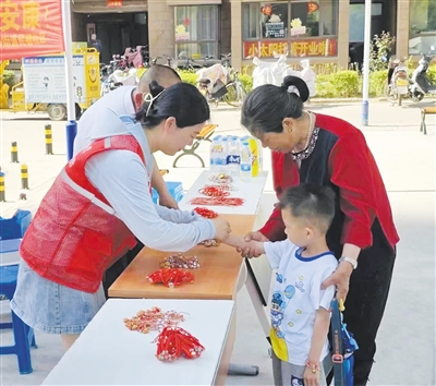 16日,平城区民德社区联合正德嘉苑物业在辖区内举行了“迎端午”主题活动,为前来的居民系上五彩绳,寄托着社区的美好祝愿。 本报记者 杨翠叶