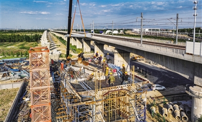 18日,集大原高铁大同段大同南站东段施工现场,货运车辆、混凝土罐车往来穿梭,吊车、混凝土泵车不断把原料运送到工作面,工人们冒着酷暑焊接钢筋、浇筑桥墩,工程建设如火如荼。