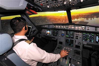 ▲ 在广东珠海翔翼飞行训练中心,飞行员在模拟机中模拟飞越深圳城市上空。