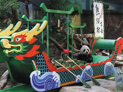 当日,广州长隆野生动物世界熊猫馆的10余只大熊猫迎来一个特别的端午节,它们与游客一起渡龙船、吃粽子,“体验”一把端午文化的氛围。