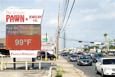 6月21日,美国得克萨斯州休斯敦市一个温度指示牌显示气温达到99华氏度(约37.2摄氏度)。