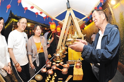 图为在鼓楼东街非遗展点,游客了解大同铜火锅。 本报记者 于宏 摄