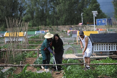 6月25日,在隆化县苔山镇三道营村一家“共享农场”,市民在工作人员的指导下劳作。