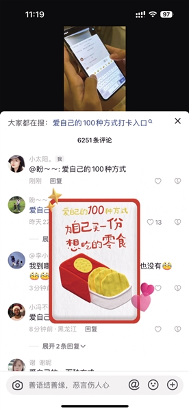 近日,话题 #爱自己的100种方式 频繁登上各社交平台热搜,只要在评论区打出“爱自己的100种方式”“我爱我”等关键词,就会弹出一个小卡片。