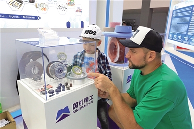 ◀ 7月1日,在白俄罗斯明斯克中白工业园,参观者在展览会上观看展品。