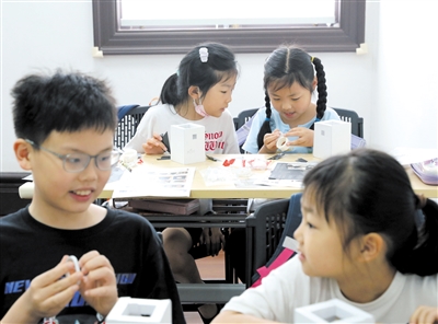 7月3日,在静安区石门二路街道办班点的蝴蝶湾党群服务中心,暑托班孩子们在进行手工制作。