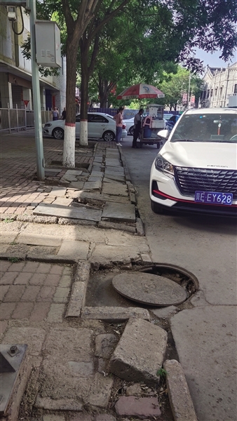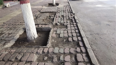 居民王先生说,司令部街长约300米,主路路况还可以,但南侧便道坑洼不平,不少地方破损严重。一些破损处用砖块等填平了,但没有夯实地基,砖块下沉后,便道出现十余处凹陷。