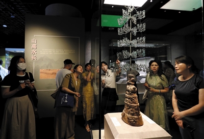 ▲7月10日,参观者在东汉摇钱树展柜前驻足观看。