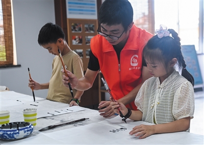 7月11日,在湖州市吴兴区道场乡浮玉花园文化礼堂的小候鸟暑期班里,志愿者在给孩子们上书法课。