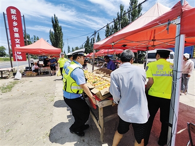本报讯 (记者 刘剑) 日前,随着云州区聚乐乡哈蜜杏成熟,吸引了众多市民游客前往购买采摘,S301省道聚乐乡聚乐村路段车流量大、人流密集。一些果农为图方便在公路边摆摊卖杏,给道路交通埋下了安全隐患。为保障人民群众的生命财产安全,云州公安分局交警大队强化日常巡逻管控,全力保障杏果成熟季路畅人安。