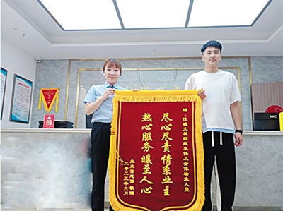 接过业主送来的锦旗,段玉娟表示,管家就是实实在在以业主为中心做好服务,她只是做了份内之事,同时也感谢徐先生的认可和激励,在以后的日子里,将会以更贴心的服务对待每一位业主。
