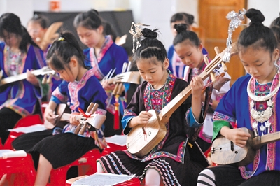 7月13日,在广西三江侗族自治县文化馆,小学生在学习弹唱侗族琵琶歌。