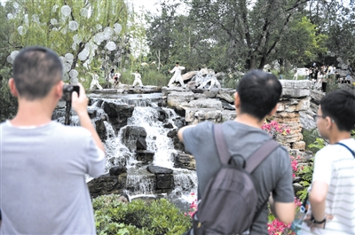 7月13日,游客在开封市万岁山大宋武侠城景区内观赏武术表演。
